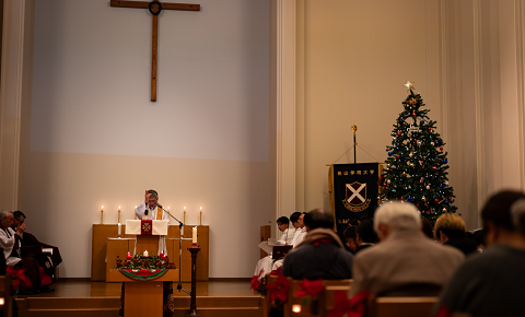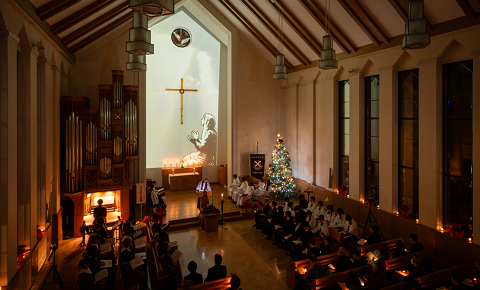 キャンドルが灯る厳かな雰囲気の中、クリスマスキャロルを歌い、イエス・キリストの誕生を祝います。