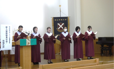 また、4月4日(木)、国際障害者交流センター(ビッグ・アイ)多目的ホールにおいて挙行された入学式では、桃山学院教育大学 聖歌隊と合同で、アンセム「The Lord bless you and keep you」を奉唱し、かけがえのない学びと経験と出会いの日々を積み重ねることができるよう祈りました。