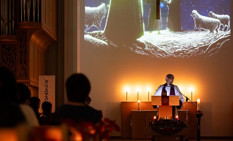 ローソクに火を灯し、いつも見慣れたチャペルとはまた違った雰囲気のなか、出席された皆さんとともに、聖歌第69番「もろびとこぞりて」や第91番「荒野の果てに」などを歌いました。