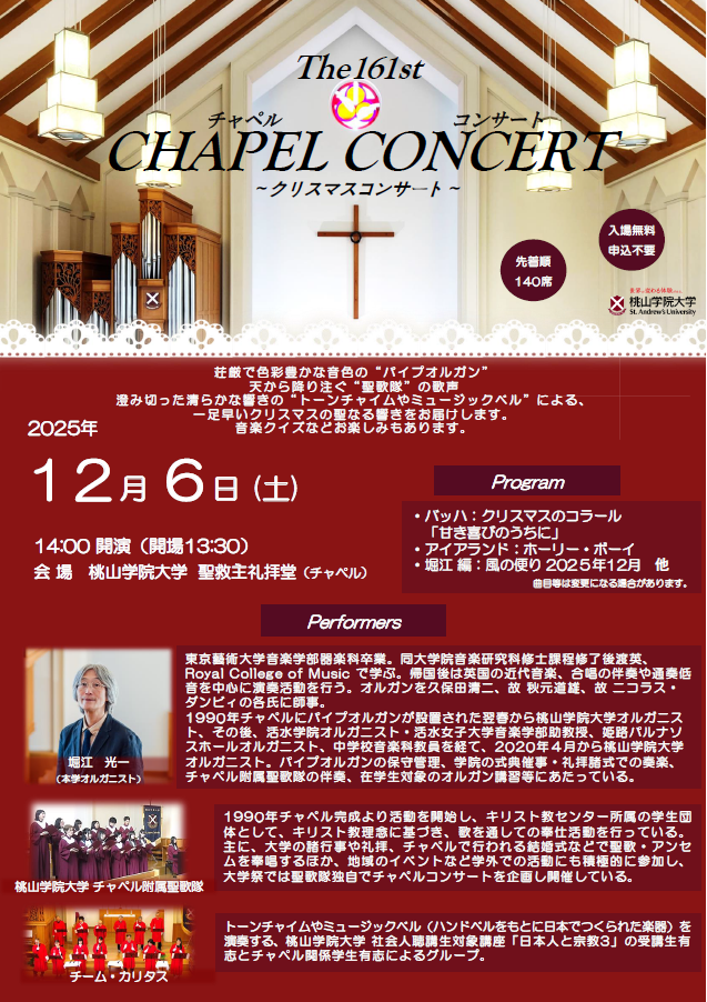 毎年12月に本学チャペルで開催されるクリスマスコンサートでは本学オルガニストの堀江光一氏による厳かなパイプオルガンの演奏と、本学チャペル附属聖歌隊の清澄な合唱、そして桃聴生(ももちょうせい:桃大の社会人聴講生の呼び名)の有志グループがこの日のために練習を重ねたトーンチャイムやミュージックベル(ハンドベルをもとに日本でつくられた楽器)の演奏を披露します。