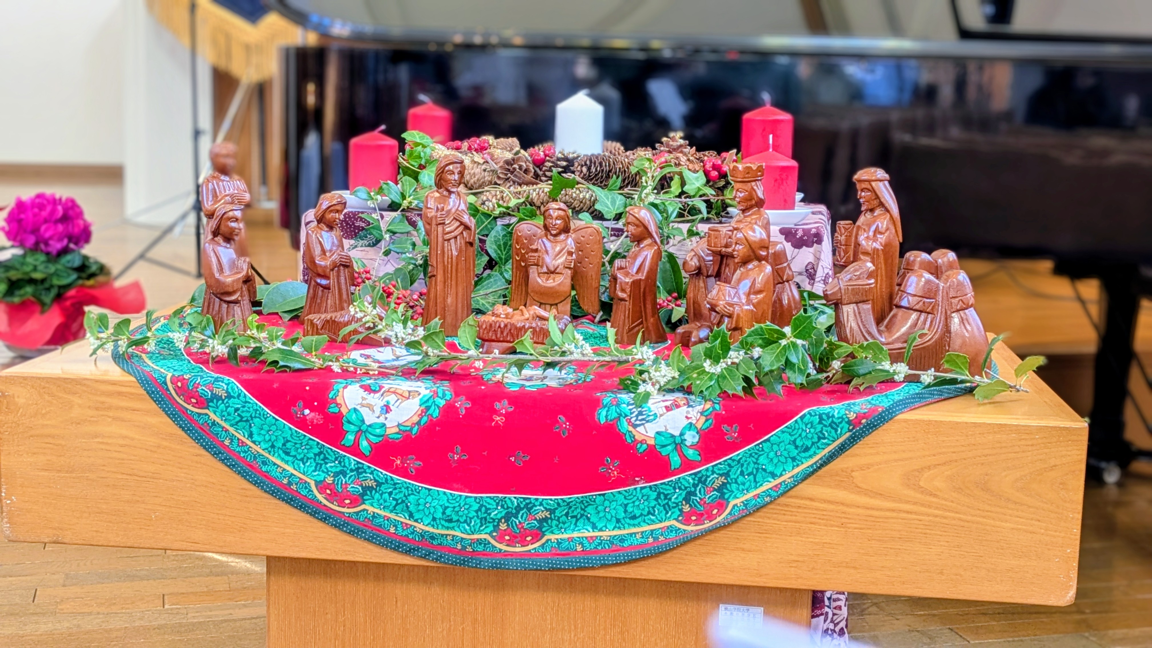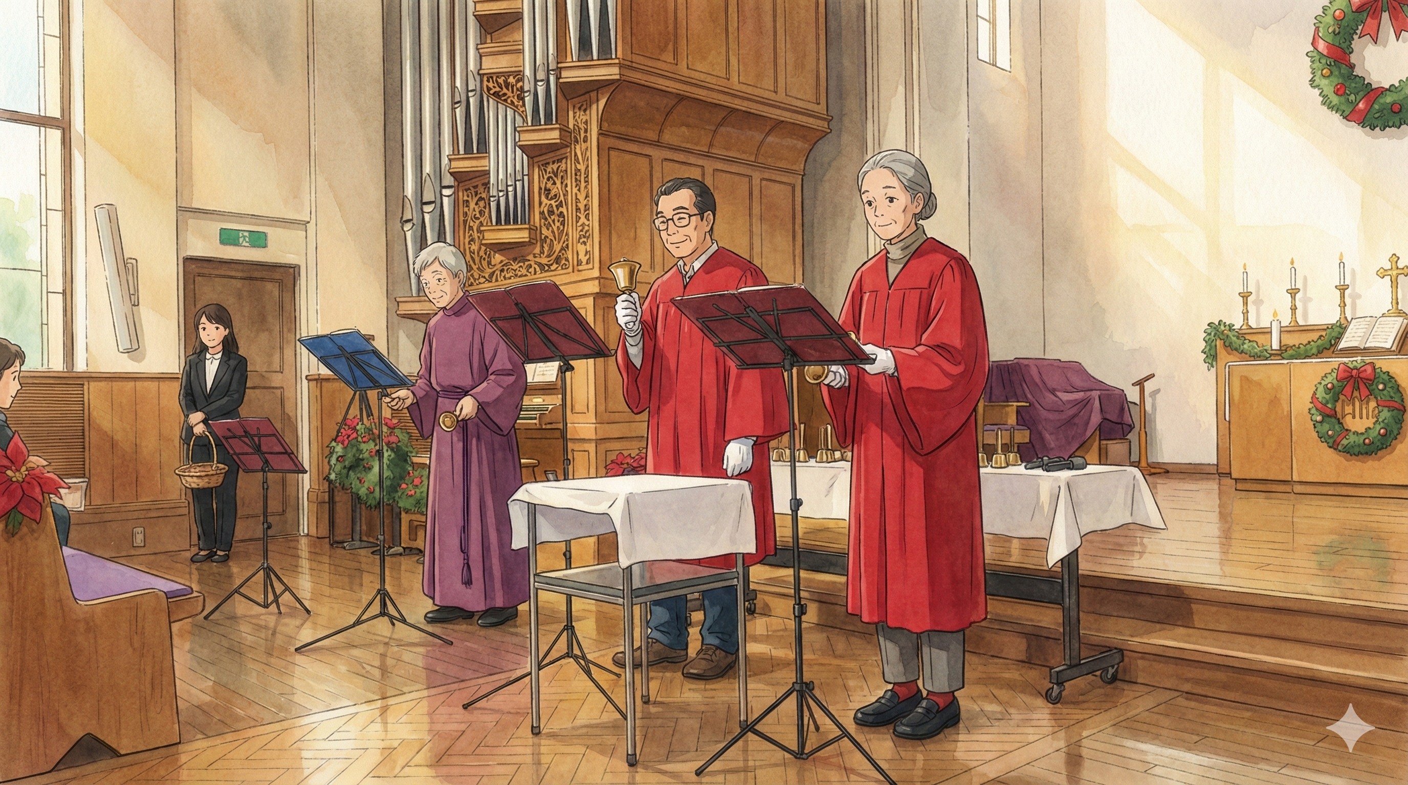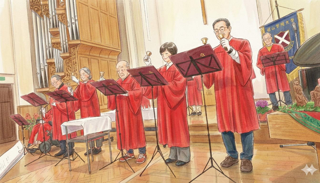- ミュージックベル、正直言って大変でした。楽譜がちゃんと読めないので、自分の受け持ち箇所を見失わないよう必死についていきました。他のメンバーも似たり寄ったりで、悪戦苦闘しておりました。しかし、宮嶋先生の𠮟咤激励や若い学生さんや留学生さんの参加もあり元気をもらい何とか乗り越えました。終わってみれば“楽しかった”の一言です。聴講生は、歳をとってはいますが、学ぶ意欲は衰えていません。こうしたプログラムに参加することは「新たな自分」を発見してゆくきっかけや始まりになっているのだと思います。クリスマスコンサートに携わった全ての人に感謝いたします。ありがとうございました。