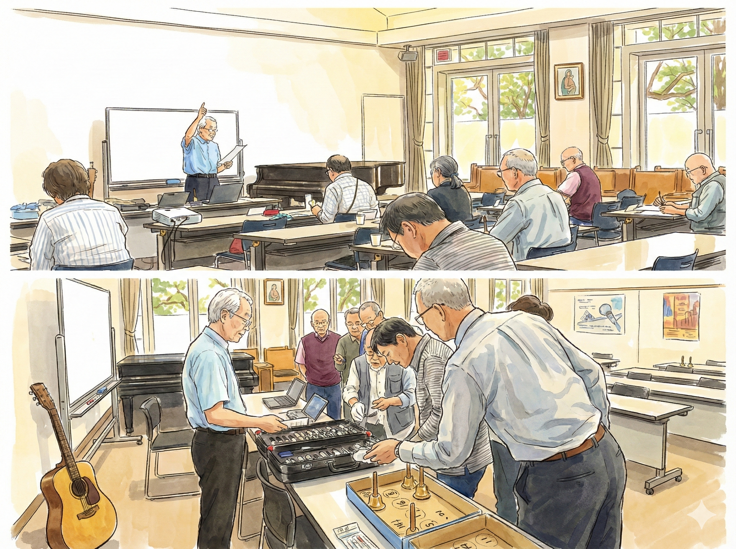 - 今年もドキドキする楽しい時間をいただきました。全く音楽的(楽器)素養のない私自身が宮嶋牧師先生の授業を通じて、年の終わりに讃美歌を楽器で受講生みんなで奏でられる機会をもらい、いい思い出ができています。人生の後半になって、人前で何かをする機会の少ない私としては痴呆予防のためにも喜んでいます。唯、音合わせには苦労しています。さて来期はいかが!!