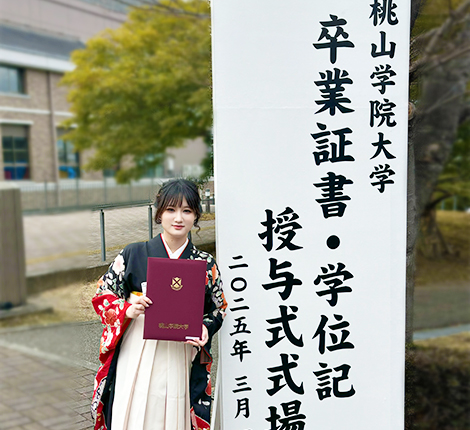桃山学院大学での二年間の学びを通して、私は多くの貴重な経験と成果を得ることができました。授業中に疑問点が生じた際には、教員の方々に質問することで、常に丁寧かつ分かりやすいご説明をいただくことができ、理解を深めることができました。