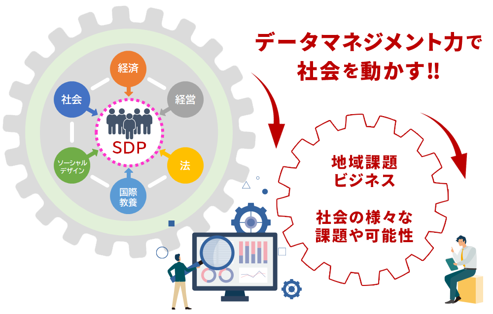 SDPの最大の特色は、桃大の既存の経営・経済・金融・社会・福祉・法律・国際・言語・スポーツ健康などの学問領域からのアプローチができることです。また、本学の教育特色である人文・社会科学、リベラルアーツの強みを活かし、データサイエンティストとして、公平性、包括性、多様性といった「倫理」を学ぶことができます。