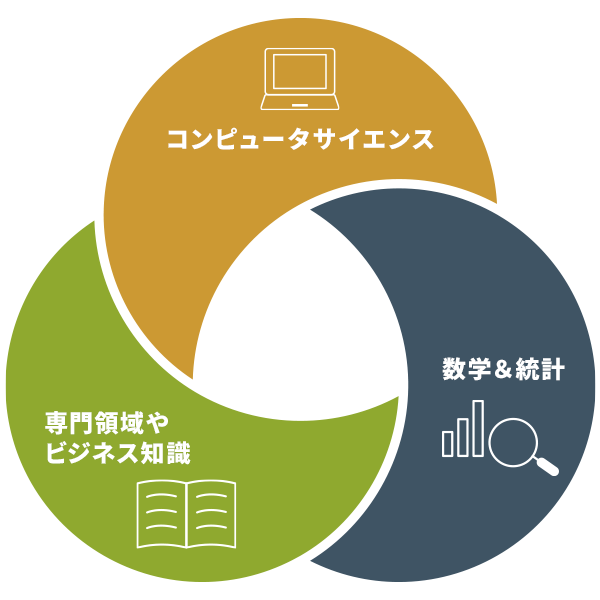 データサイエンスとは、様々な対象のデータを適切な方法で収集・解析を行い、新しい事実を浮かび上がらせる研究手法です。プログラミングを含む「コンピュータサイエンス」、データからパターンを見つけるための「数学&統計」、「ビジネスや専門領域の知識」を総合的に学ぶ学際的なアプローチです。