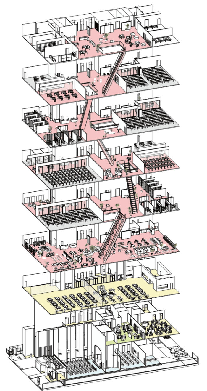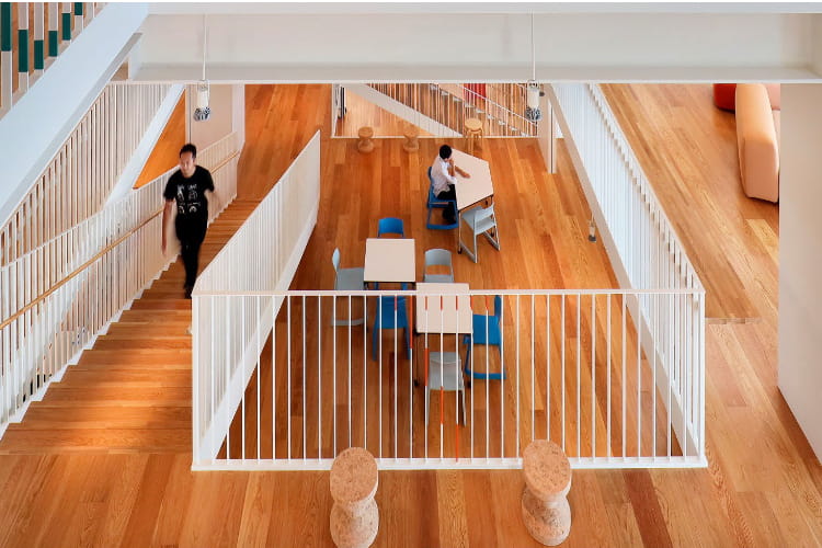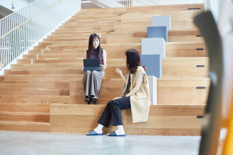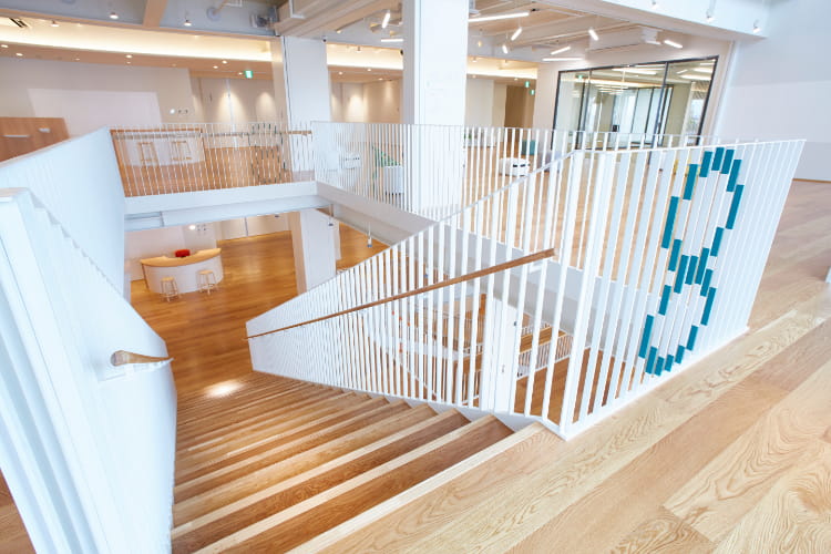グループワークやプレゼンテーションなど、コミュニケーションスペースを各フロアのホワイエ(ロビー)に配置し、教室も、入口の壁を取り外しカーテンとすることでフロア全体をひとつの教場としてつなげるなど、柔軟な発想を生みやすい環境を整えています。
