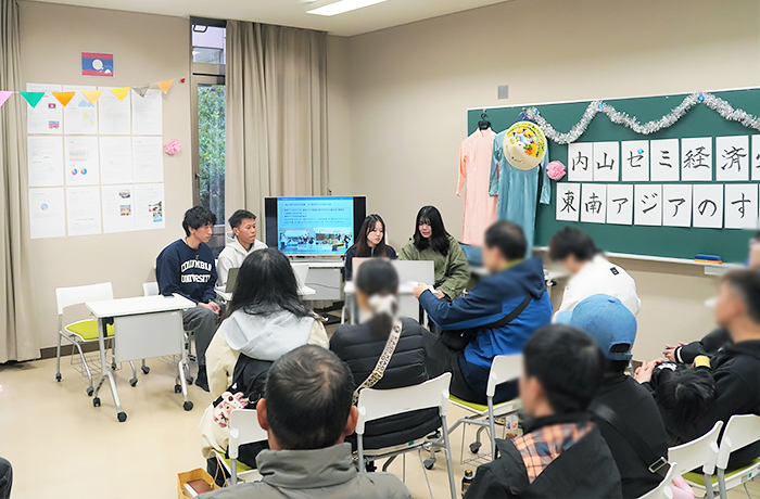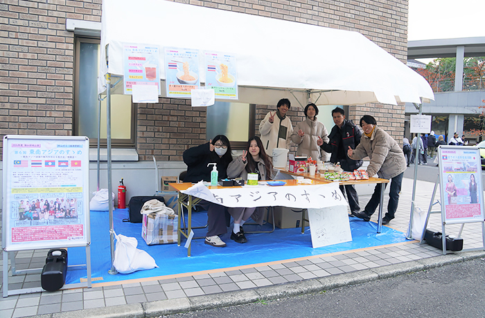 内山ゼミの3年次は秋の桃山祭で、「東南アジアのすゝめ」と題して、研究対象である東南アジア諸国の魅力を紹介する展示会と、同地域の名物料理をふるまう模擬店を運営します。西岡さん、辻本さんらは2024年度の第64回桃山祭において、展示会では5カ国を担当する班ごとに、各国の歴史や経済の現状・課題、魅力などを解説する資料や動画、民族衣装を展示したほか、来場者に楽しんでもらう東南アジア・クイズ、ラオスにいるゼミ卒業生(後述のナム先生)との公開オンライン対談、マレーシア班と留学生によるトークショーなどを実施しました。また模擬店ではタイ産のトムヤムヌードルとグリーンカレーヌードル、ベトナム産フォー等を販売しました。