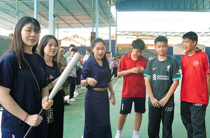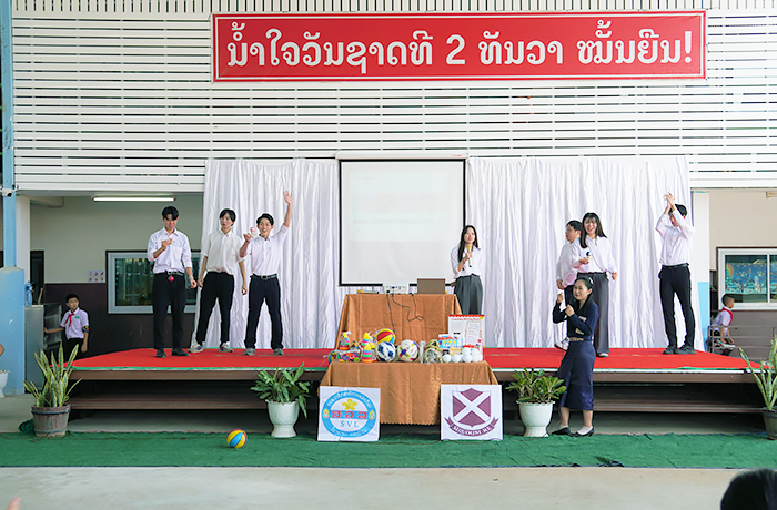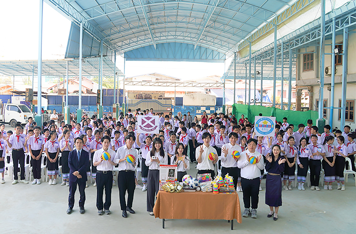 授業のほかに、中学校全生徒224名を対象に、私たちの訪問趣旨を説明したり、桃山学院大学や日ラオス関係、日本の伝統文化について紹介するプレゼンテーションをナム先生の通訳のもと行いました。「現地では小・中学校と大学で計2回、プレゼンテーションを実施しましたが、国内での事前準備から本番まで、内容を何度も練り直し改善を重ねました。中学生対象のプレゼンでは、前日のリハーサルで楽しい要素をより増やすべきだという話になり、けん玉やあやとりの実演・紹介、寸劇を交えた日本語のことわざ解説等を盛り込みました。修正は前夜の午前3時までかかり大変でしたが、今となってはよい思い出です。」 (西岡さん)と、小中学生に関心を持ってもらえる内容を追求しました。その結果、「けん玉を披露する場面は特に盛り上がりました。実際に挑戦してもらいましたが短時間でコツを掴み、かなりうまくなる子もいました」(辻本さん)と振り返ります。ほかに企画したスポーツ交流会では、現地でなじみの薄い野球教室を実施したり、フットサルの親善試合も行ったりしました。サッカーは特に人気のスポーツで、「フットサルは、めちゃくちゃ強かったです」(辻本さん)と楽しいひと時を過ごしました。