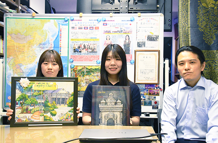 経済学部・内山怜和ゼミ(東南アジア経済専攻)は、東南アジア諸国の経済・社会について、3・4年次の2年間で学修するゼミです。ゼミ長・副ゼミ長を務める4年次の西岡李梨さんと辻本望帆さんは、ラオス人民民主共和国(以下、ラオス)の開発研究に取り組む一方で、ゼミのメンバー(他18名)とともに、桃山祭(大学祭)において東南アジア諸国の魅力を発信したり、ラオスを訪問し現地の小・中学校に教育関連物資を贈呈するなど、国内外で様々な活動を展開しています。研究や一連の活動で何を学び、自らの将来にどう生かすのか、二人にその意義を話してもらいました。