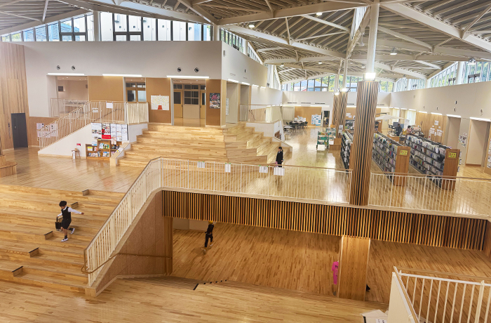 中央に交流スペースを設けた槇尾学園の校舎には、地元素材である「いずもく」が使用されており、