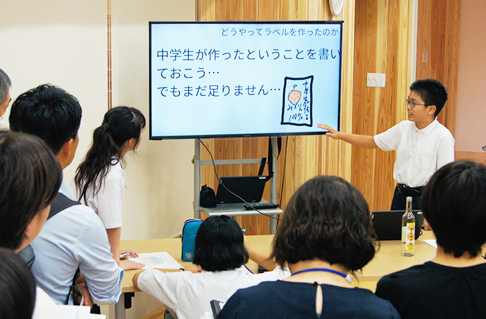 特に7年生は、ミカンジュースの容器に張り付けるラベルをデザインするラベルデザイン班と農業班に分かれ、デザイン班はプロデザイナーによる講義のもと、自分たちでデザインを考え、和泉市内全中学校の教員を前にプレゼンテーションを実施。採用デザインをコンペ方式で決めました。