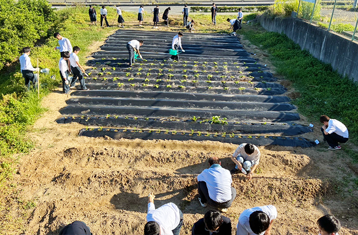 農業班は夏休みに耕作放棄地に生えた雑草の除草、耕運機をつかった耕し、苗を保護するマルチシートの敷設に取り組み、苗を植え付けました。天王寺かぶらは、そのほとんどを害虫に食い荒らされてしまいましたが、そこで教員は手を差し伸べることなく、グッと我慢。子どもたちが様々な気づきを得るまで見守りに徹しました。天王寺かぶらが害虫の被害にあう一方で、金時ニンジンとにんにくには害虫被害がみられないことに気付いた生徒が「天王寺かぶらの周りに、金時ニンジンとニンニクを植え付ければ、害虫を防除できるのではないか」と提案しました。実はこの方法、実際に有機農業の現場でも取り入れられたことがある方法だったのです。それを、子どもたち自らが失敗から考察や工夫を重ねてひとつの答えを導き出した。正に、探究型授業の成果といえる出来事でした。