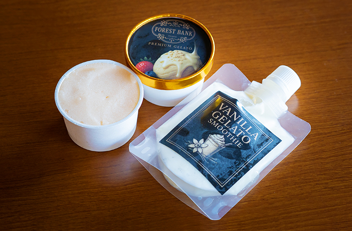 マダガスカル産バニラビーンズと兵庫県産の味噌を使ったバニラジェラート(右)。