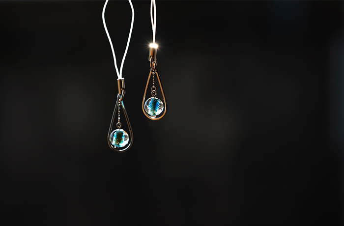 佐竹ガラスの商品「地球玉」を生かしたアクセサリー類を、5種類制作した。