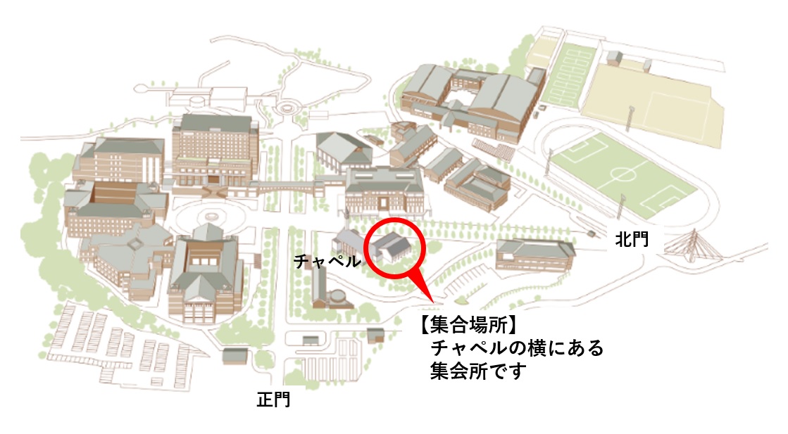 集合時間までにチャペル集会室(チャペル左横の建物内)にお越しください。