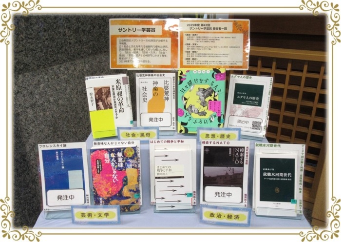 | 2025 | ミニ展示「図書館de試験対策」 ミニ展示「みんなで考えよう!クマ問題」 企画展示「聖地、行っとく?」 特別企画展示「万華鏡の中の日本ー『風俗画報』でみる江戸・明治・大正ー」 常設展示「芥川賞・直木賞2025上半期」 ミニ展示「まずはマンガからはじめよう!」 ミニ展示「レポート・論文2025春(6月)」 ミニ展示「大阪・関西万博 ~いま考え のちに繋げる ちきゅうの輪~」 ミニ展示「My New Life~新生活の始めかた~」 企画展示「図書館の歩き方+(プラス)」 特別企画展示「【図書館】本で色相環【つくってみた】」 |