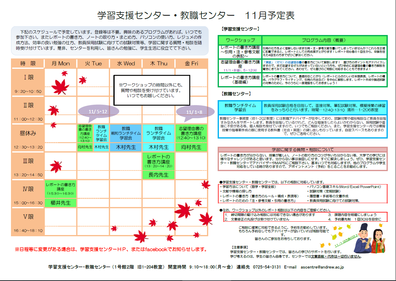 11月のワークショップは《レポートの書き方講座~基礎編~》、《レポートの書き方講座~引用・注・参考文献の表記~》と《志望理由書の書き方講座》です。