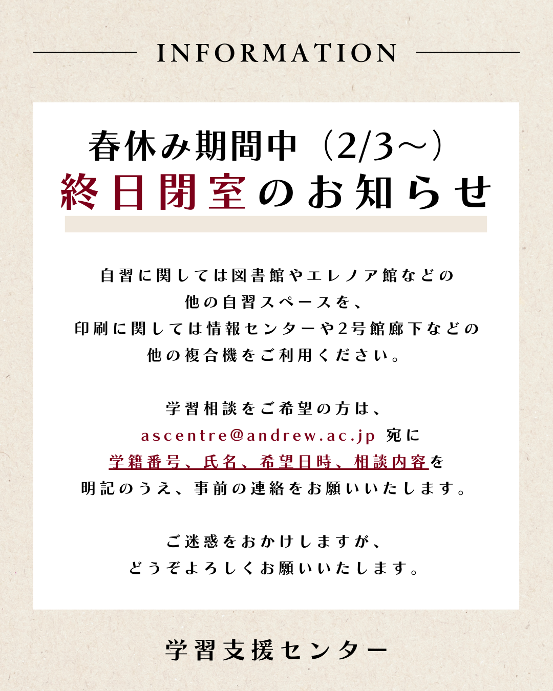 お手数ですが、学習支援センターのアドレス(ascentre@andrew.ac.jp)宛に、