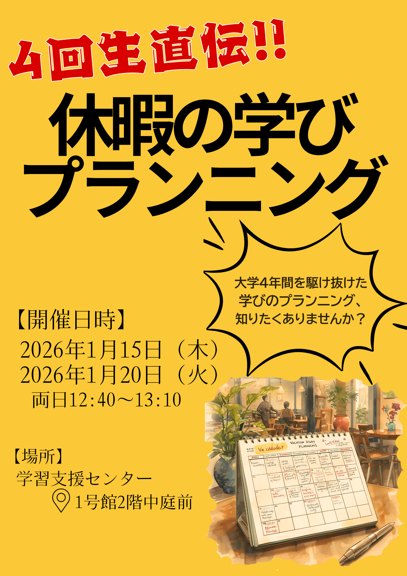ワークショップ【4回生直伝!!休暇の学びプランニング】を開催します!