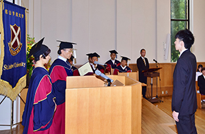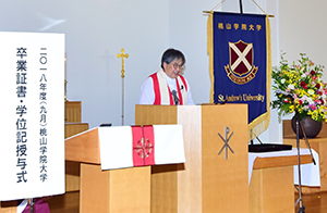皆さん、ご卒業おめでとうございます。ご家族、ご親戚、保護者の皆様、おめでとうございます。桃山学院大学の教職員を代表し、心よりお祝いを申しあげます。