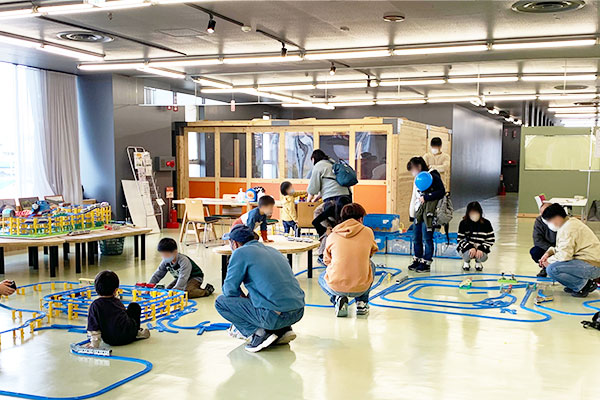 「プラレールを走らせよう!」のイベントでは、ボランティアスタッフの学生が子どもたちのサポート役として活躍しました。
