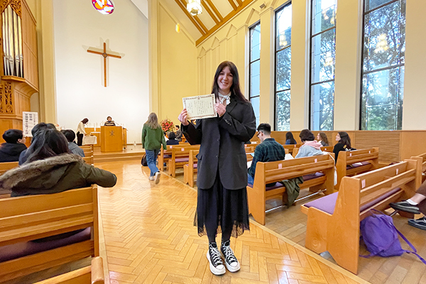 チャペルで行われた修了礼拝ではパイプオルガンの荘重な調べのもと、修了生を祝福する祈りをささげ、全員に友沢昭江・国際センター長から修了証を手渡しました。