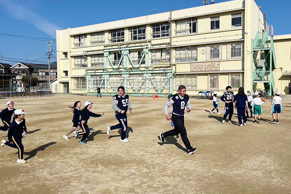 2月14日(水)、本学アメリカンフットボール部の学生が和泉市立南池田小学校の児童にフラッグフットボールの指導を行いました。