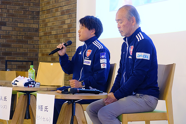 高橋選手はブラインドサッカーチーム大阪ダイバンズに所属しており、日本代表強化指定選手Aに選出されているストライカーです。この日はブラインドサッカーをサポートし、「ダイバーシティ・エクイティ&インクルージョン社会」の実現を目指す化学メーカーの株式会社ダイセルの山本伸吾さん、西村恒治さんと共に「ブラインドサッカーの現在と未来」というテーマで講演会をスタートしました。