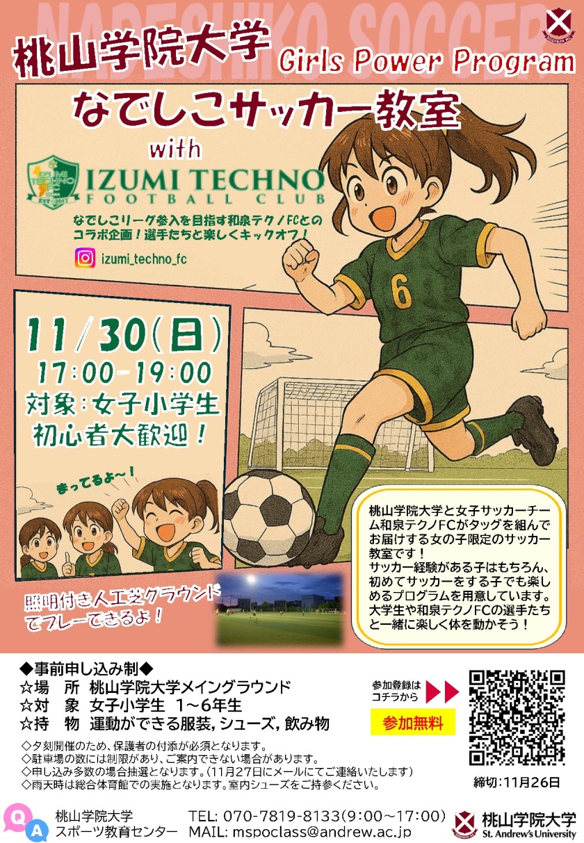 今回は、桃山学院大学と女子サッカーチーム和泉テクノFCがタッグを組んでお届けする女の子限定のサッカー教室を開催します。
