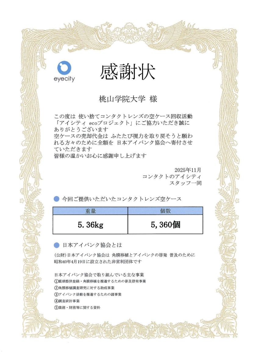 本学では、和泉市、HOYA株式会社アイケアカンパニーと3者協定を締結し、使い捨てコンタクトレンズの空ケースを回収する取り組みを行っています。回収した空ケースの売却代金は、日本アイバンク協会へ全額寄付されます。