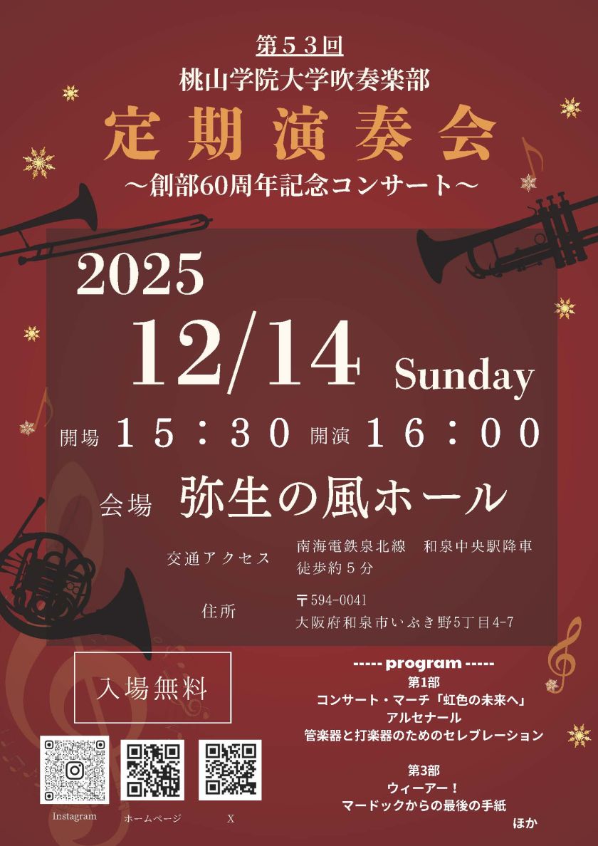 この節目の年に桃山学院教育大学と統合となって仲間が増え、吹奏楽部は新しい一歩を踏み出しました。これまでの良さを大切にしながら、さらににぎやかで温かい雰囲気の中、みんなで音楽づくりを楽しんでいます。新しい出会いと新しいハーモニーで、これからも心に響く演奏をお届けしていきます。