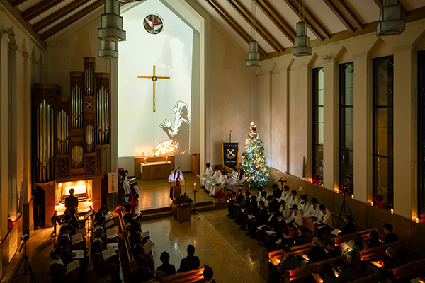 先唱者と聖歌隊による交唱、学長をはじめ教職員や学生によるキリスト誕生に関わる6か所の聖書朗読、メッセージに代わる演劇部と学院長による「もう一人の博士」の朗読劇、チャプレンによる祈祷が行われました。そしてそれらの間をつなぐように学生によるアドベントクランツへの点灯、パイプオルガンの奏楽、聖歌隊のアンセム、学生によるミュージックベルとトーンチャイムの演奏が行われました。礼拝堂正面の大きな壁にはテック部制作のプロジェクションマッピングが投影され、クリスマスの情景を描き出しました。