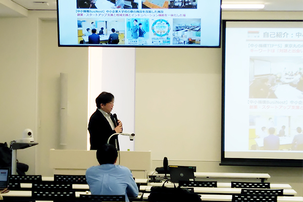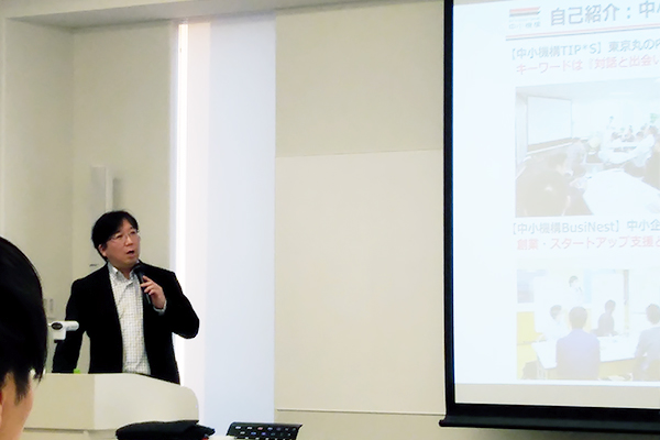ドメインA特講「経営支援実務」(担当:服部繁一准教授)に中小企業基盤整備機構(以下、中小機構)の岩井智洋氏をゲスト講師にお招きし、国が実践する中小企業支援についてご講義いただきました。