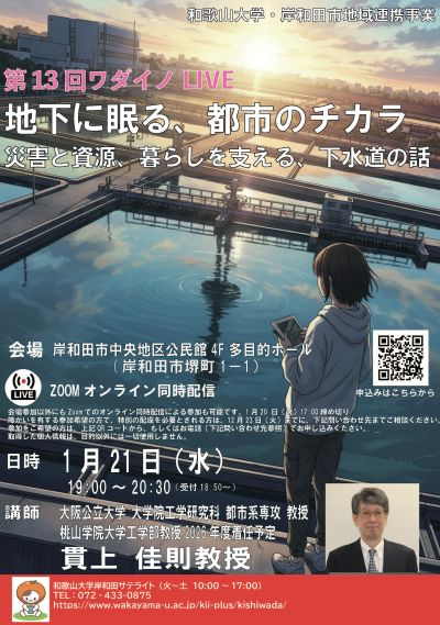 2026年1月21日(水)に開催される「第13回ワダイノLIVE」において、貫上佳則 教授(就任予定/工学部工学科都市デザイン工学専攻<2026年4月開設>)が登壇します。 詳細は以下のとおりです。どなたでもご参加いただけます。 ◆講演日時:2026年1月21日(水)19:00~20:30(受付18:50〜) ◆会場:岸和田市中央地区公民館(岸和田市堺町1-1) 会場参加以外にもZoomでのオンライン同時配信による参加も可能です。(申し込み締め切り:1月20 日(火)17:00 ) ◆講演内容:テーマ「地下に眠る、都市のチカラ 災害と資源、暮らしを支える、下水道の話」 都市の下水道という存在は、ふだん人々の意識から最も遠い場所にありながら、都市の生命維持に欠かせない“循環の要”である。水環境を保全し、洪水を防ぎ、都市の基盤を静かに支え続けるこの仕組みは、私たちの暮らしの背後で膨大な働きをしている。 本講演では、下水道が現代都市にもたらす機能と課題、その未来的役割までを俯瞰し、“都市を支える地下の世界”を多角的に見つめ直す機会としたい。 ◆入場無料 ◆主催:和歌山大学岸和田サテライト 問合せ、申し込みは和歌山大学岸和田サテライトまでお願いいたします。 和歌山大学岸和田サテライトWebサイト チラシはこちら (920KB) 本学が包括連携協定を締結している岸和田市との連携事業の一環として、和歌山大学・岸和田市の連携事業であるワダイノLIVEに毎年1講座講師を派遣しています。 前の記事へ一覧表示へ