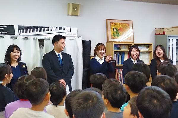 八木ゼミでは、学生のボランティア活動に多世代交流活動を推進しています。今回は、「健康な生活ってなんだろう?~生活習慣をととのえて、みんなで毎日の生活に気をつけて健康になろう」をテーマに、藤田巧さん、橋本しずくさん、岸本みかささん(学校保健コース)、山原芽衣さん(スポーツ科学コース)が手作りした「ジャンボカルタ」を用いて授業実践に挑みました。