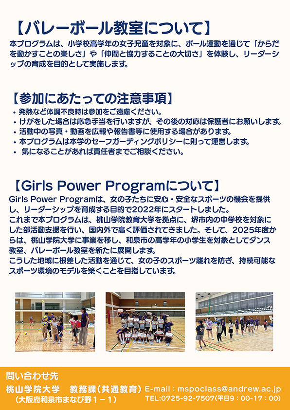 「Girls Power Program」は、女の子たちに安心・安全なスポーツの機会を提供し、リーダーシップを育成する目的で2022年に桃山学院教育大学を拠点にスタートしました。
