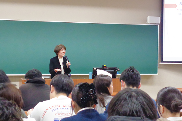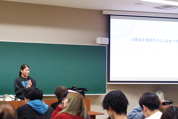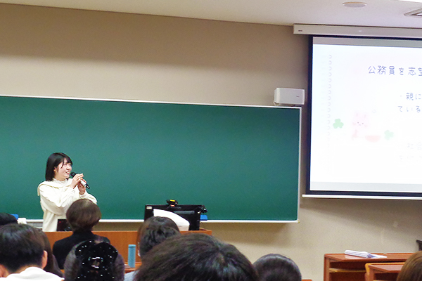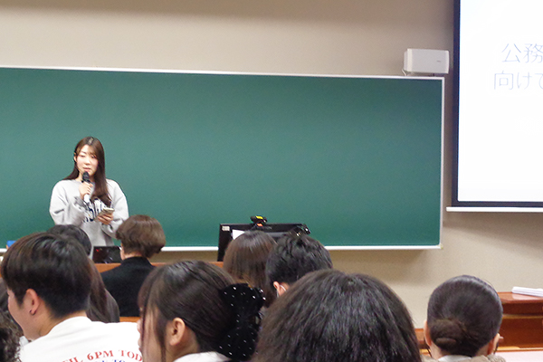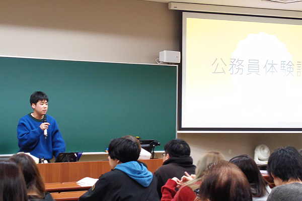 1月7日(水)に行われた2年次の授業では、公務員試験に合格した4年次生4名から、受験に向けた体験談を聞く機会を設けました。実際の経験に基づく話は、これから受験を控える学生にとって、具体的なイメージを持つ貴重な機会となりました。