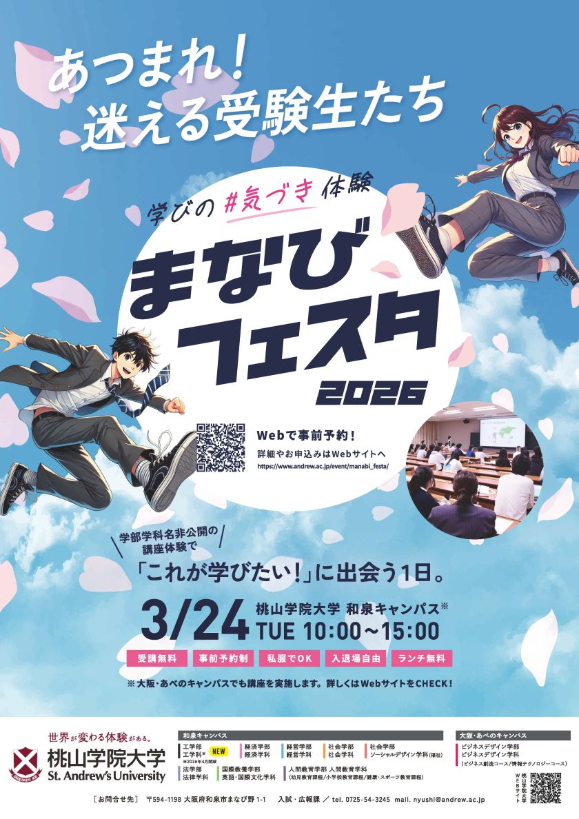 桃大に興味がある方はもちろん、進路に迷っている方や、まだ志望学部が決まっていない方、大学の雰囲気を体験してみたい方にもぴったりのイベントです。ぜひご参加ください!