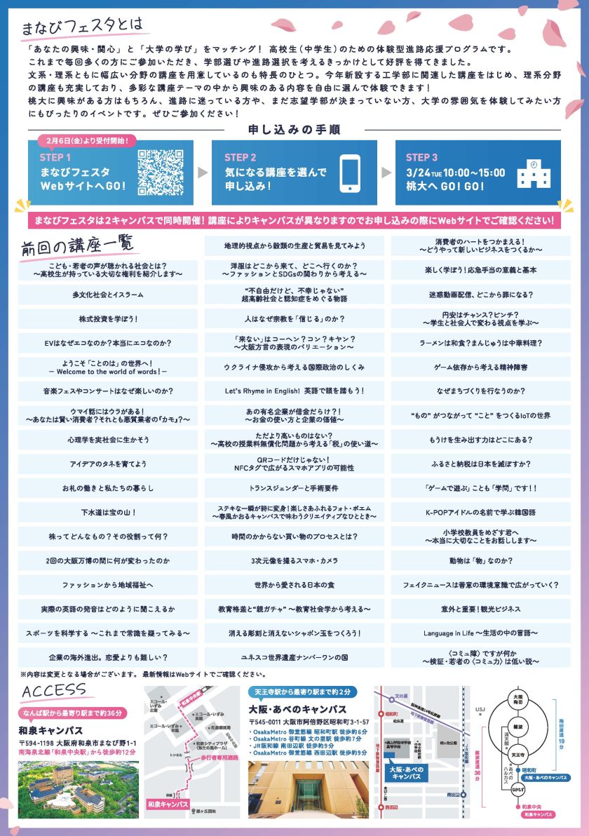 ※まなびフェスタは、和泉キャンパスと大阪・あべのキャンパスで同時開催します。講座によりキャンパスが異なりますのでお申し込みの際にWebサイトでご確認ください。