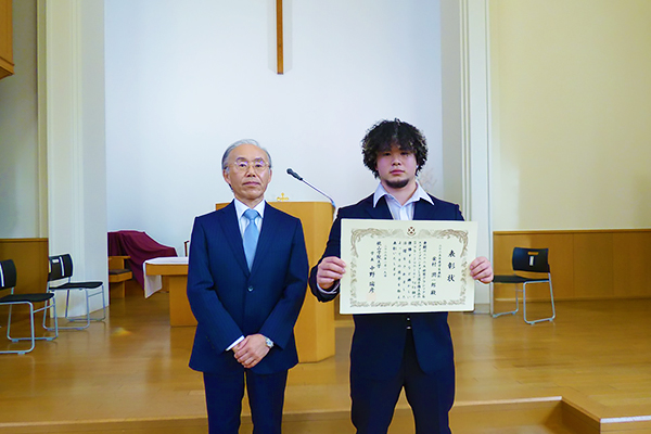 顕著な活躍が認められた学生の功績を称えて、中野瑞彦学長より表彰状が授与され、更なる活躍を期待して激励の言葉がありました。