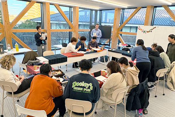 12月には交流イベントとして「Global English and Lateral Thinking Quiz大会」を行いました。外国語教育センターの英語教員が出題した、イギリスやオーストラリアなど教員の出身国に関する問題やクリスマス文化に関する問題、英語の言語的特徴を問う問題などに挑戦し、参加者は英語を通じて各国の文化やニュースを楽しく学びました。