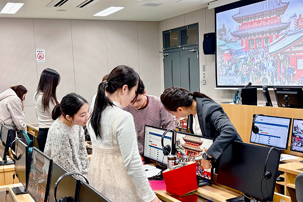 また、e-learningによる個別学習と、対面でのグループディスカッションを組み合わせたアクティブラーニング型の「TOEIC総合トレーニング集中講座」を受講し、メンバーからは「リスニング力・リーディング力が伸びた」「TOEICテストのコツをつかむことができた」といった声が寄せられています。国際教養学部1年次のメンバーは、「担当のTan先生は明るく、質問にも丁寧に答えてくれるので学習意欲が高まります。TOEIC模擬テストで300点以上スコアが上がったのは、この授業のおかげだと思います」と話してくれました。