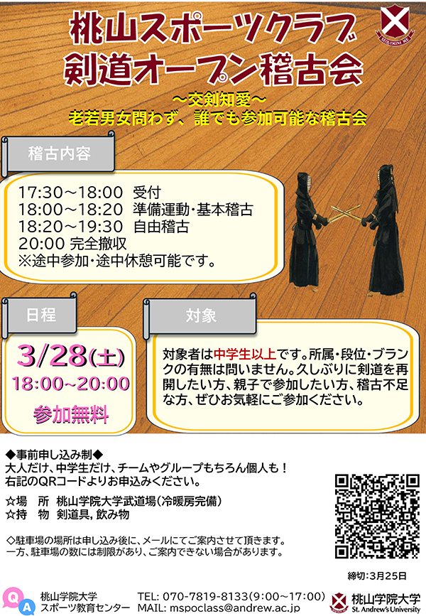 桃山スポーツクラブ「剣道オープン稽古会」を以下のとおり開催いたします。