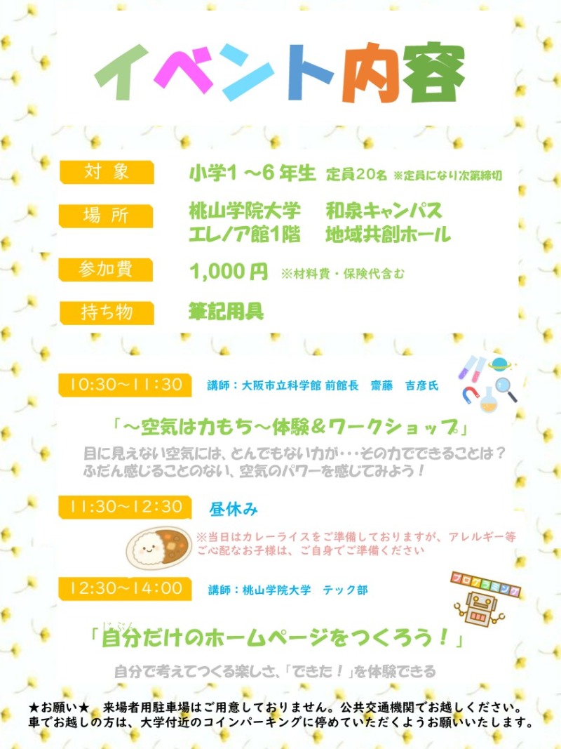 講師に大阪市立科学館 前館長の齋藤吉彦氏をお迎えし、「~空気は力もち~ 体験&ワークショップ」や、本学テック部によるプログラミング教室「自分だけのホームページをつくろう!」など、多彩なプログラムをご用意しております。