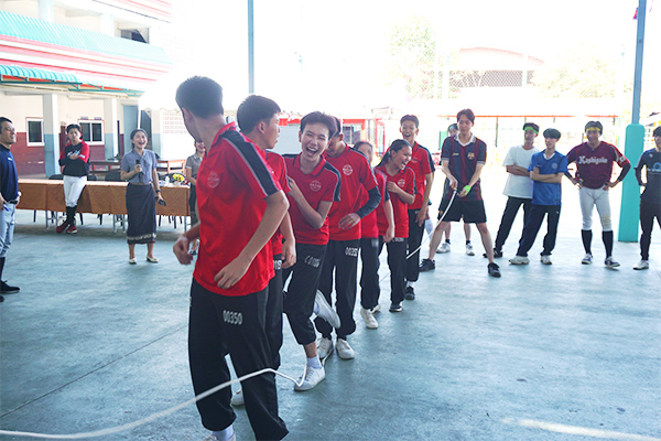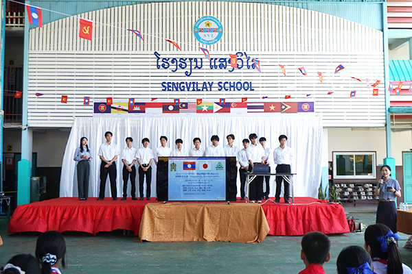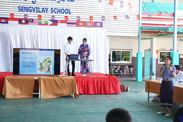 19日午前には、中学校の全校生徒222名を対象にプレゼンテーションを行いました。訪問の目的や日本とラオスの経済関係、日本の観光地や伝統的な遊びの紹介を行ったほか、準硬式野球部によるピッチング、レスリング部による怪力自慢、バスケットボール経験者によるパフォーマンスなどを披露しました。