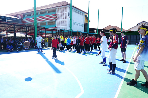 午後からは、中学4年生53名を対象にスポーツ交流会を実施しました。これまで実施してきた野球教室やフットサルの親善試合に代え、より多くの生徒が参加できるよう運動会形式で実施し、4チームに分かれて大縄跳び、フリースロー(バスケットボール)、PK(フットサル)、リレーの4種目で競い合いました。