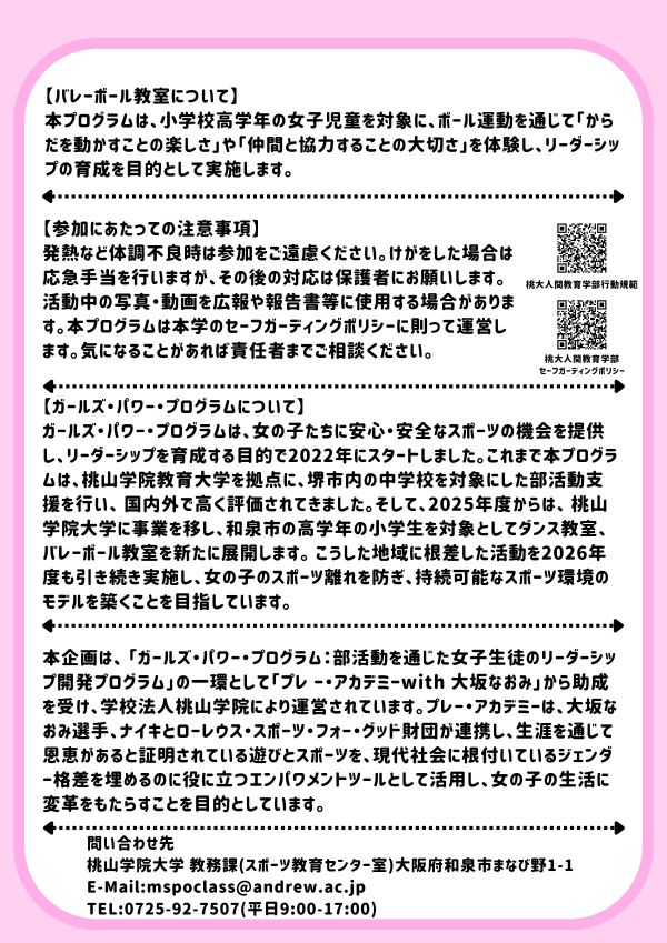 「Girls Power Program」は、女の子たちに安心・安全なスポーツの機会を提供し、リーダーシップを育成する目的で2022年に桃山学院教育大学を拠点にスタートしました。