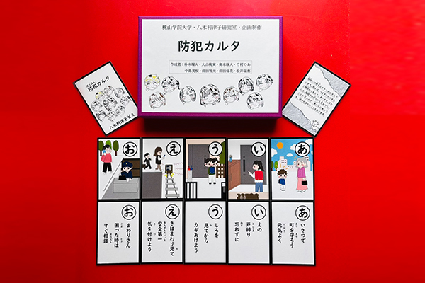 八木ゼミでは「ここで変わる。自分も、未来も。地域と共に」をスローガンに掲げ、地域の子どもたちと共に防犯学習を行うなど、地域の安全レベル向上を目的とした課外ボランティアに継続的に取り組んでいます。今回紹介された「防犯かるた」は多世代が親しんで学べる教材として、これまでのボランティア活動の成果から生み出されたものです。