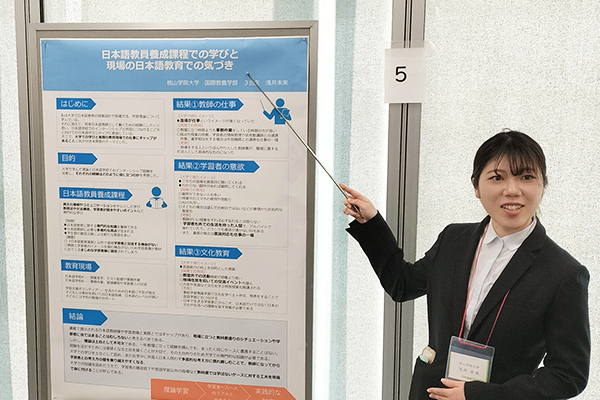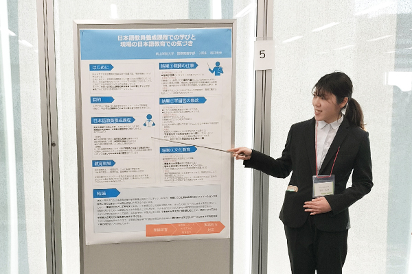 本シンポジウム内の「第1部 近畿日本語教育スチューデント・フォーラム」において、本学国際教養学部3年次の浅井未来さんが登壇し、これまでの学びと経験について発表を行いました。発表では、日本語教員養成課程で学んだ知識と実際の教育現場でのインターンシップを通じて得た気づき、そしてその間に生じるギャップなどについて、自身の経験を踏まえた内容が共有されました。