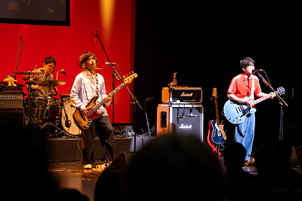 また昨年に引き続き、本学卒業生(平部雅洋さん、十九川宗裕さん)が所属する3ピースバンド「reGretGirl(リグレットガール)」が登場しました。代表曲「ホワイトアウト」など3曲を披露し、大学時代の思い出や新入生へのエールを語りました。